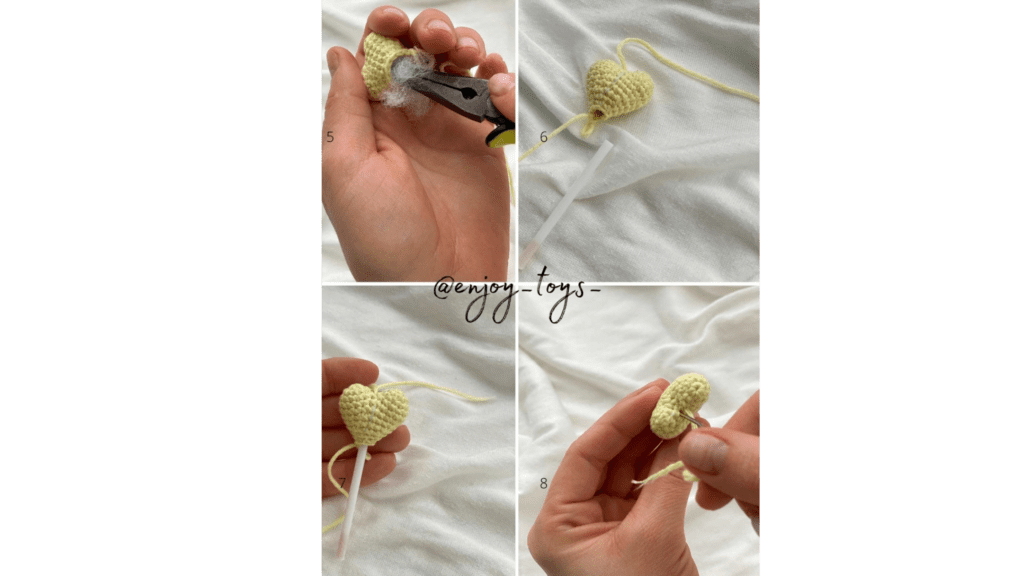 Fasten off, cut, and hide the thread. Sew the hole at the top of the heart.