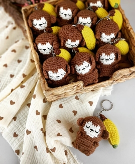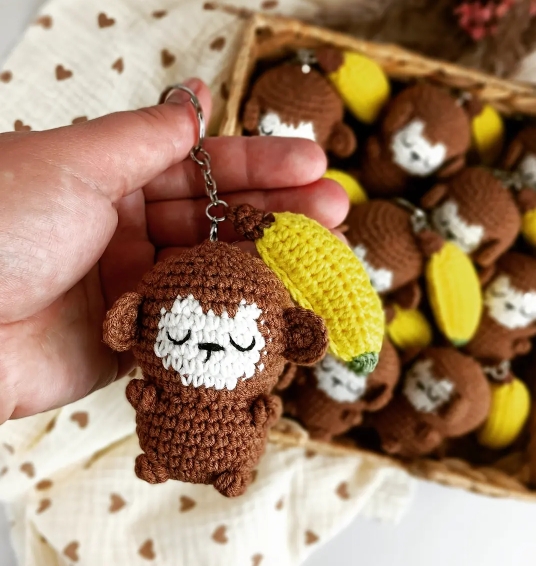 Recommended hooks are 2 mm for the monkey and 1.75 mm for the banana. But you may use a hook that suits your tension better. Also, have a tapestry needle, fiberfill, and keychain ring.