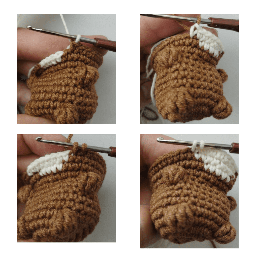 17 rnd: Brown 19 sc, Milky 2 sc, Brown 3 sc, Milky 2sc, Brown 14 sc (40)